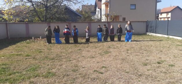 Диван првоновембарски дан за боравак у дворишту другара из продуженог боравка. Такмичење у скакању у врећама.