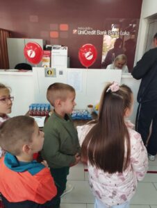 Поводом свјетског дана штедње 31.19.другари средње, старије и мјешовите вртићке групе, посјетили су Уникредит и Рајфајзен пословницу, гдје су им љубазни домаћини појаснили чему служи банка, ко ради у банци, како се у банци може штедјети и сл. Открили су чему служе штедни рачуни, банкомати и зашто су нам банке потребне. По одласку из банке запосленици банке су сву дјецу развеселили пригодним поклонима.